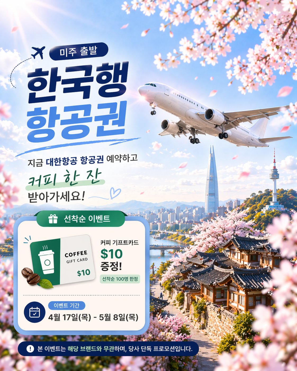 미주 출발 한국행 대한 항공권 예매하고 커피 기프트 카드 받아가세요!